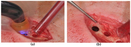 The defects were filled with either BioM1 or BioM2. Prior to insertion of the biomaterials, the holes were dried using sterile cotton balls. When relative dryness was reached, the gel-like biomaterials were quickly injected in 2 mm thick layers and instantly photopolymerized for 40 s each using a calibrated dental light curing unit (Bluephase, 830 mW/cm², Ivoclar–Vivadent, Ellwangen, Germany). Polymerzation is shown in Figure 7a. After the bone defects were completely filled, the surface of each polymerized biomaterial was whipped once with a 70% ethanolic solution (Figure 7b). The position of the filled defects sites was marked by insertion of a 4 mm long titanium pin (Geistlich Biomaterials, Baden-Baden, Germany). The position of the pin in relation to the defect sites was transferred to a transparent plastic foil which was used for relocation after euthanasia. Subsequently, the periosteum was closed and the muscle fascia, subcutaneous tissue and skin were sutured with an absorbable thread.