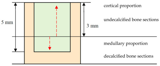 After the decalcification process, samples were dehydrated in an alcoholic series and embedded into paraffin. Each paraffin block was then sectioned and the obtained 5 µm thick samples stained with hematoxylin eosin (HE). Histological allocation of the collected bone specimens can also be observed in Figure 8.
