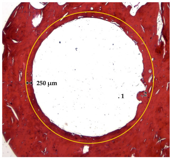 Decalcified and HE stained sections with a ROI of 250 µm (yellow circle). Biomaterial body (1) is in close contact to the surrounding bone (2).