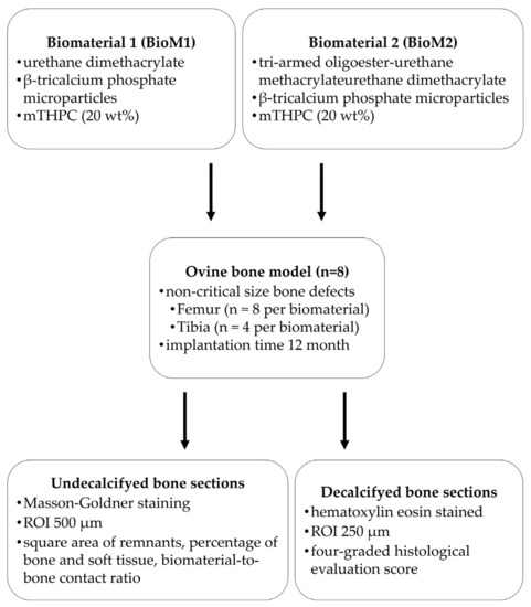 The results of the present study revealed that BioM1 (photosensitizer-armed urethane dimethacrylate) was bone-integrated to a significantly higher extent compared to BioM2 (photosensitizer-armed oligoester-urethane methacrylate). In case of BioM1, high-quality bone was formed in the ROI without any signs of adverse effects. Due to the slow degradation of BioM1, structural stability is provided for a longer period of time. In contrast, implantation of BioM2 resulted in chronic inflammation and increased fibrous tissue formation at the bone-to-biomaterial interface.