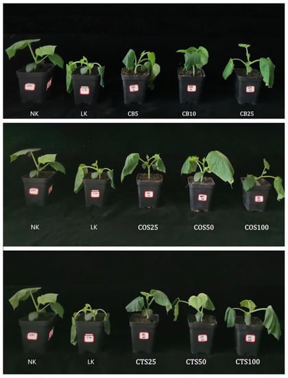 Phenotypic characteristics of cucumber seedlings treated with different exogenous substances under cold stress (12 °C/6 °C, day/night) after 24 h. NK group represents cucumber seedlings sprayed with distilled water and subjected to normal temperature (28 °C/18 °C, day/night). LK group represents cucumber seedlings sprayed with distilled water and subjected to cold stress. GB5, GB10, and GB25 groups represent cucumber seedlings sprayed with 5 mM, 10 mM, and 25 mM GB subjected to cold stress, respectively. The COS25, COS50, and COS100 groups represent cucumber seedlings sprayed with 25 mg·L−1, 50 mg·L−1, and 100 mg·L−1 COS subjected to cold stress, respectively. The CTS25, CTS50, and CTS100 groups represent cucumber seedlings sprayed with 25 mg·L−1, 50 mg·L−1, and 100 mg·L−1 CTS subjected to cold stress, respectively.