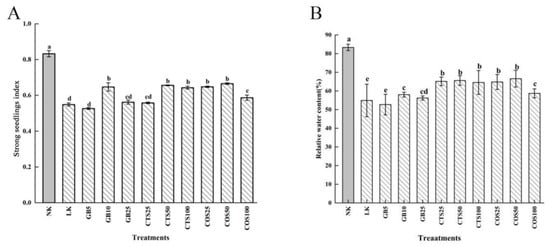 When exposed to low-temperature stress for 120 h, the strong seedling index and relative water content of cucumber seedlings, following treatments in the LK group and the group treated with exogenous substances, decreased compared with those in the NK group (Figure 3). The GB10, CTS50, and CTS100 (100 mg·L−1 CTS-sprayed group, cold stress), COS25 (25 mg·L−1 COS-sprayed group, cold stress), COS50, and COS100 (100 mg·L−1 COS-sprayed group, cold stress) groups all showed significant differences in the strong seedling index compared with those in the LK group. Among them, the GB10, CTS50, and COS50 groups showed increases of 17.85%, 19.49%, and 21.26%, respectively (Figure 3A). Compared to the LK group, the CTS25, CTS50, CTS100, COS25, and COS50 groups showed significant differences in relative water content, among which the CTS50 and COS50 groups showed increases of 19.49% and 21.25%, respectively (Figure 3B).