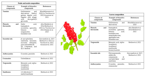 See Figure 1 for a summary of the main phytochemicals present in the different parts of the plant, and Table 1 and Table 2 for a detailed analysis of the extract composition based on the solvent, methods used for the extraction, and analysis of Sumac extracts composition.