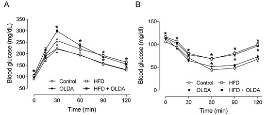 2.1. OLDA Does Not Affect Glucose Tolerance and Insulin Sensitivity in HFD-Fed Mice