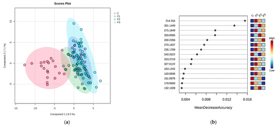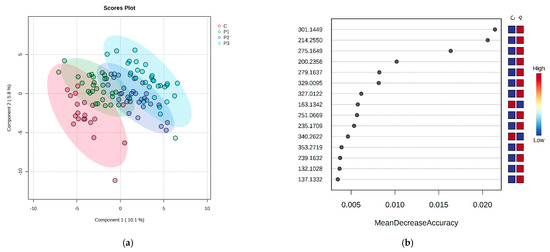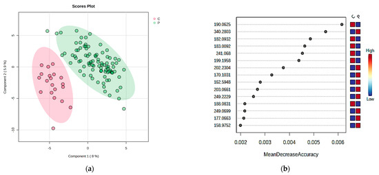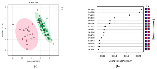Multivariate analysis of serum samples: (a) PLSDA score and plot for serum samples; (b) MDA scores according to Random Forest analysis.