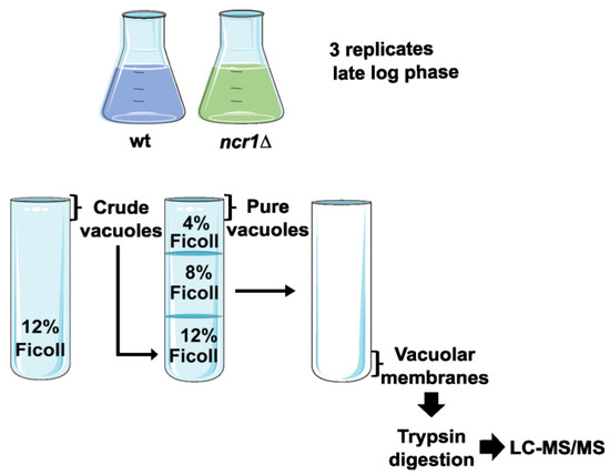 Overview of the experimental design. Wild-type (wt) and ncr1∆ cells were grown in SC medium to late exponential phase [late log; (OD600 nm ≅ 2)]. Vacuoles were isolated by density centrifugations using Ficoll gradients and vacuolar membranes recovered after osmotic lysis of vacuoles. Samples were then digested with trypsin, and protein identification and quantitation were performed by nanoLC-MS/MS.