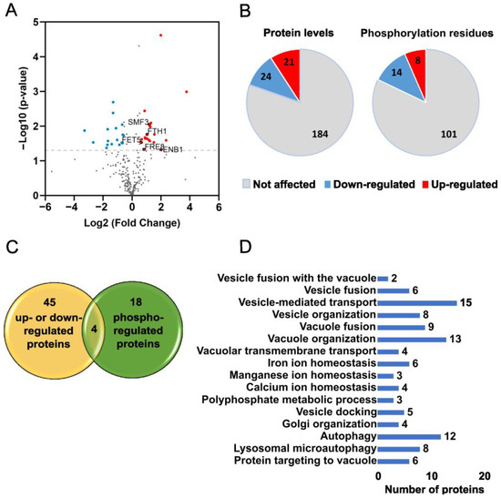 Overview of the phosphoproteomic analysis from ncr1∆ vacuolar membranes. (A) Volcano plot for differentially expressed proteins in ncr1∆ vs. wild-type samples. Log-transformed p-values (Student’s t-test) in the vertical axis are plotted against log-transformed fold change in the horizontal axis. The horizontal dashed line marks a p-value of 0.05. Red plots represent the up-regulated proteins with a 1.5-fold change threshold, and blue plots represent the down-regulated proteins (log2 fold change of +/−0.58). Red plots with black outlines represent the proteins associated with iron homeostasis. (B) Number of proteins and number of phosphorylation sites significantly up- or down-regulated in the ncr1∆ mutant. (C) Overlap of proteins with alterations in the levels and phosphorylation in ncr1∆ samples. (D) Gene Ontology (GO) term enrichment analysis on biological processes was performed for proteins with statistical alterations in ncr1∆ samples (levels and phosphorylation).