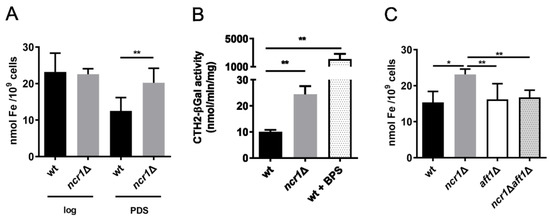 Ncr1-deficient cells accumulate iron at post-diauxic shift (PDS) phase in an Aft1-dependent manner. (A) Total iron levels were quantified in wild-type (wt) and ncr1∆ cells grown to exponential (log) and PDS (48 h after log) phases. (B) Wild-type and ncr1Δ cells expressing the Aft1 binding sequence from CTH2 promoter fused to a LacZ reporter were grown to the exponential phase, and β-galactosidase activity was determined. Wild-type cells treated with 20 µM of bathophenanthrolinedisulfonic acid (BPS) for 4 h (wt + BPS) were used as positive control. (C) Iron levels were quantified in wt, ncr1Δ, aft1Δ, and ncr1Δaft1Δ cells grown to the PDS (48 h after log) phase. Data are the mean ± SD of at least three independent experiments. * p ≤ 0.05; ** p ≤ 0.01 (Student’s t-test).