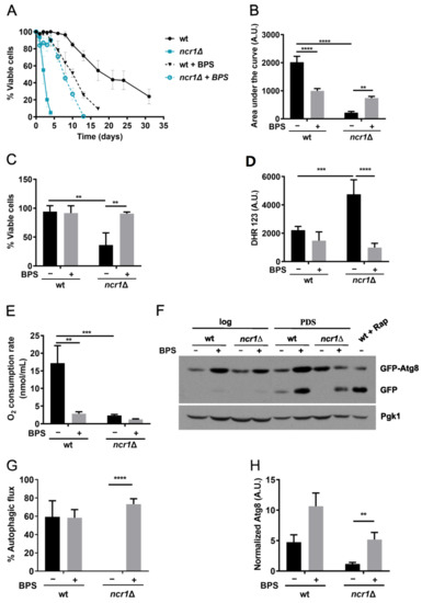 Chelating iron with BPS increases the chronological lifespan, oxidative stress resistance, and autophagic flux of ncr1∆ cells. (A) Wild-type and ncr1Δ cells were grown to post-diauxic shift [(PDS), 24 h after log] phase and maintained overtime in SC medium (wt, ncr1∆) or SC medium supplemented with 80 µM of BPS (wt + BPS, ncr1∆ + BPS). Cellular viability was expressed as the percentage of the colony-forming units in relation to day 0. Data are the mean ± SEM of at least three independent experiments. (B) The area under each lifespan curve was computed using GraphPad in arbitrary units (A.U.). Data are the mean ± SEM. ** p ≤ 0.01; ****, p ≤ 0.0001 (one-way ANOVA). (C) Cells were grown to PDS (24 h after log) phase in medium supplemented or not with 80 µM of BPS and exposed to 5 mM H2O2 for 1 h. Cell viability was measured as the percentage of the colony-forming unit (treated cells vs. non-stressed cells). Values are the mean ± SD. ** p ≤ 0.01 (two-way ANOVA). (D) Cells were grown to PDS (48 h after log) phase in medium supplemented or not with 80 µM of BPS and intracellular reactive oxygen species were analyzed by flow cytometry, using Dihydrorhodamine 123 (DHR123) as probe. Data are the mean ± SD. *** p ≤ 0.001; **** p ≤ 0.0001 (two-way ANOVA). (E) Cells were grown to PDS (24 h after log) phase in medium supplemented or not with 80 µM of BPS and oxygen consumption rates were measured. Values are the mean ± SD (two-way ANOVA), ** p ≤ 0.01, *** p ≤ 0.001. (F) Cells carrying pRS416-GFP-ATG8 were grown to exponential (log) and PDS (48 h after log) phases in medium supplemented or not with 80 µM of BPS. Proteins were analyzed by immunoblotting using anti-GFP antibody. As positive control, wild-type cells grown to exponential were treated with rapamycin (200 ng mL−1) for 4 h (wt + Rap). A representative blot of at least three independent experiments is shown. The original blots are shown in Supplementary Figure S8. (G) Autophagic flux was calculated by the ratio between the free GFP signal and the sum of free GFP and GFP-Atg8 signals. Values are the mean ± SEM. **** p ≤ 0.0001 (Multiple Student’s t-tests). (H) Atg8 levels were calculated by the ratio between free GFP plus GFP-Atg8 and Pgk1 signals. Values are the mean ± SEM. ** p ≤ 0.01 (Multiple Student’s t-tests).