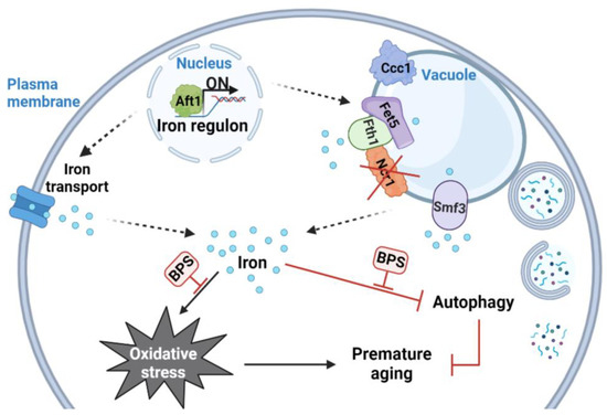 Several compounds are known to increase lifespan in part by decreasing free iron, protecting against oxidative damage [87]. Iron deficiency downregulates TORC1 activity [88], whose inhibition is largely associated with lifespan extension and healthspan in several organisms [89]. In yeast, iron limitation increases lifespan by inhibiting TORC1 and inducing autophagy [83]. Epigallocatechin gallate, an iron chelator, extends mice and rats’ lifespans by increasing the activation of autophagy and decreasing oxidative stress [90,91]. As TORC1 activity was lower in ncr1∆ cells (Figure 4B), the increase in the autophagic flux of the mutant treated with BPS is, probably, TORC1 independent. These data point to the existence of another mechanism by which autophagy is regulated by iron. Our results also implicate that loss of iron homeostasis impacts the autophagic flux in the yeast model of NPC disease. The identification of the molecular players involved in this regulation will contribute to our understanding of the molecular basis of the NPC1 disease. Notably, high levels of iron increase sphingolipid synthesis and sphingolipid signaling through the Pkh1 protein kinase [92], and we have previously shown that phytosphingosine (PHS) but not dihydrosphingosine (DHS) levels increase in ncr1∆ cells, leading to Pkh1 activation and a shortened chronological lifespan [56]. Plus, the hydroxylation of DHS to PHS is mediated by the iron-dependent protein Sur2 [93,94], and iron chelation decreases the accumulation of PHS, but not of DHS [95]. More studies are required to define if iron depletion increases the longevity of the yeast model of NPC1 through modulation of Pkh1 signaling. In summary, our results suggest that vesicle trafficking pathways and iron homeostasis are deregulated in cells lacking Ncr1 and implicate iron overload on the high oxidative stress sensitivity, impaired autophagic flux, and premature aging exhibited by the yeast model of NPC1 (Figure 7). This study supports a link between iron toxicity and NPC phenotypes, but more studies are required to clarify if iron chelation may be explored as a therapeutic strategy aimed at counteracting the development of this disease.
