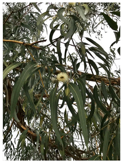Eucalyptus leaf extracts and EO have long been used in the pharmaceutical, sanitary, agricultural, cosmetic, and food industries because of their beneficial and healthy properties [25,26]. In fact, traditionally, Eucalyptus leaves have been widely used for the treatment of various diseases such as influenza, dysentery, pulmonary tuberculosis, cystitis, diabetes, articular pain, fungal infections, dermatitis, scabies, and burns [25,27].