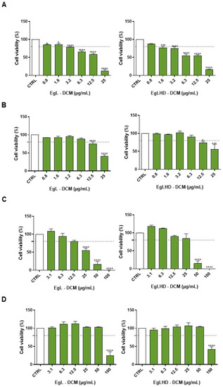 Figure 3. Effect of the lipophilic extracts from E. globulus leaves before (EgL) and after (EgLHD) hydrodistillation obtained with dichloromethane (DCM) on the cell viability of RAW 264.7 macrophages (A), NIH/3T3 fibroblasts (B), HepG2 hepatocytes (C), and Caco-2 intestinal (D) cells. The cells were treated for 24 h with 0–100 µg mL−1 of EgL or EgLHD, and the cell viability was evaluated using a 3-(4,5-dimethylthiazol-2-yl)-2,5-diphenyltetrazolium bromide (MTT) reduction assay. Cells treated with the medium alone were used as a control (CTRL). The results were expressed as the percentage (%) of cell viability relative to the CTRL and represent the mean ± standard error of the mean (SEM) of at least three independent experiments performed in triplicate. The statistical analysis was carried out by one-way analysis of variance (ANOVA) followed by a Dunnett’s multiple comparison test. * p < 0.05, *** p < 0.001, and **** p < 0.0001: significantly different compared to the CTRL.