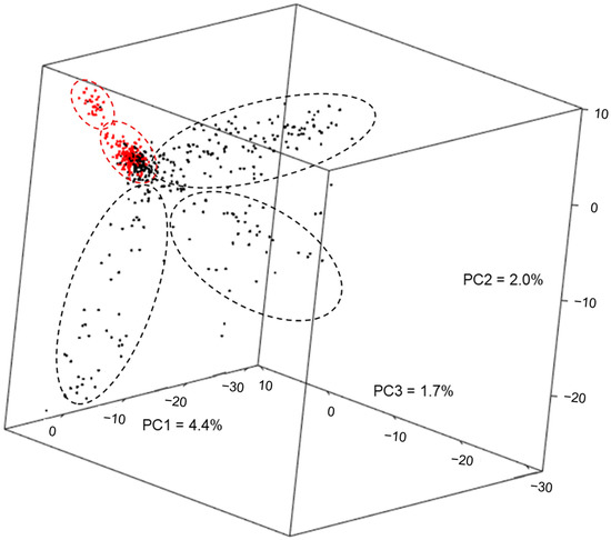 Principal component analysis of 563 inbred lines, including 365 lines from Embrapa (black dots) and 198 from DTMA panel (red dots) based on the first three principal components (PC). The percentages represent the genetic variance explained by each PC. The dashed black circles indicate three clusters of Embrapa lines (black dots) representing Flint, Dent and C groups; and the dashed red circles indicate two clusters of DTMA lines (red dots).
