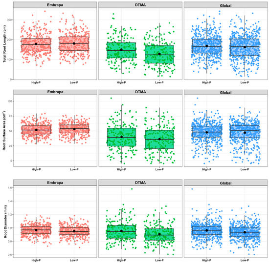 Boxplots showing the distribution of root morphology traits in the Embrapa, DTMA and for the global maize panels in high- and low- P concentrations. Phenotypes are BLUEs for root length in cm (RL), root surface area in cm2 (SA) and root diameter in mm (RD).