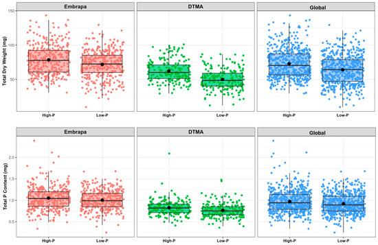 TDW and PCont increased in high-P compared with P deficiency in the global and Embrapa panels, without significant change in the DTMA panel (Table 3 and Figure 3). For these traits, the Embrapa lines presented higher genetic variance compared with the DTMA panel (Table 3), reflecting a wider dispersion of phenotypic values in the boxplot (Figure 3).