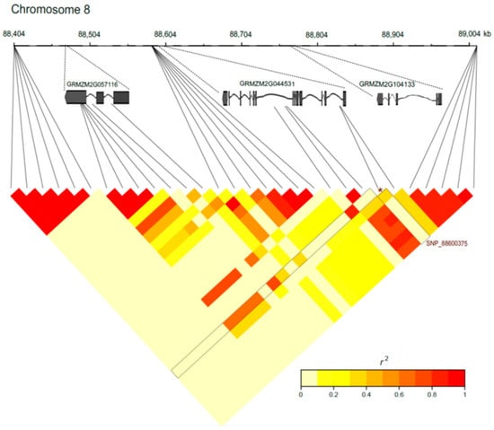 Linkage disequilibrium in a 609.6 kb region within the bin 8.03 of the chromosome 8. The black lines represent each SNP and the asterisks depict the most significant SNP of this region, SNP S8_88600375, for root length under low-P conditions. The positions of the predicted genes GRMZM2G057116 (WRKY member), GRMZM2G044531 (AGC kinase) and GRMZM2G104133 are shown.