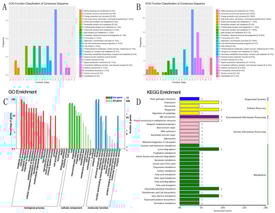 70], which was used to annotate the effect impact, function class, codon change distance, amino acid change, gene name, transcript biotype, gene coding, transcript ID, exon, and intron rank warning error for each SNP. An annotation analysis of differentially expressed genes was the basis for further explanation of gene function. The KEGG database is the primary public database for this pathway. The presence of genes in specific regions was studied using pathway enrichment analysis [