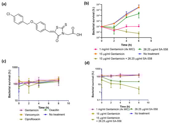 After that, time kill kinetics were performed to evaluate its activity toward bacteria from different growth phases. Stationary-phase bacteria are known to be tolerant to being killed by antibiotics [] while a small proportion of antibiotic-tolerant bacterial cells are present in the exponential phase. In agreement with the screening results, in exponential-phase S. aureus, SA-558 on its own had no activity but caused 2-log reduction in bacterial viability when combined with gentamicin (Figure 1b). SA-558, up to 100 μg/mL tested, showed no activity against exponential phase bacteria (Figure S2a). As expected, treatments of stationary phase bacteria with different antibiotics alone caused no decrease in viable count, indicating they are tolerant to being killed by antibiotics (Figure 1c,d). In contrast, SA-558 alone caused around 1-log reduction in bacterial viability of stationary phase S. aureus (Figure 1d). Two-log reduction in bacterial viability of stationary-phase S. aureus was observed when combined with 15 μg/mL of gentamicin (Figure 1d). SA-558’s effect on exponential phase and stationary phase S. aureus was further tested in two CA-MRSA strains, which are USA300-3 and LAC, and similar observations were attained in the Mu3 strain (Figure S2b–e). These results indicated that SA-558 alone is preferentially active against stationary phase S. aureus that can tolerate antibiotic killing.