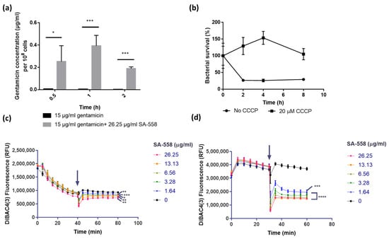 Effect of SA-558 on membrane potential and gentamicin uptake. (a) Total concentration of gentamicin inside S. aureus Mu3 after exposure to antibiotic/compound treatments. Statistical significance was determined by Student’s t test (* p < 0.05 and *** p < 0.001); (b) Time kill kinetics of combination of SA-558 and gentamicin on S. aureus Mu3 pre-treated with CCCP; (c,d) Effect of SA-558 at concentrations ranging from 26.25 to 1.64 μg/mL on membrane potential of the (c) exponential phase and (d) stationary phase S. aureus Mu3 strain. Change in DiBAC4(3) fluorescence over time was presented. The arrow indicated the time of compound addition. Statistical significance in comparison to untreated S. aureus was determined by one-way ANOVA (* p < 0.05, ** p < 0.01, *** p < 0.001 and **** p ≤ 0.0001).