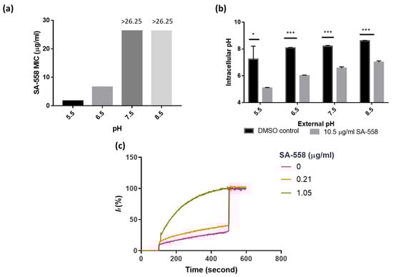 Effect of SA-558 on intracellular pH. (a) SA-558 MIC against S. aureus Mu3 in a function of media pH, from 5.5 to 8.5. (b) Effect of SA-558 on bacterial intracellular pH, at external pH ranging from 5.5 to 8.5. (c) SA-558 effect on HPTS-loaded liposome, at different concentrations. Statistical significance was determined by Student’s t test (* p < 0.05 and *** p < 0.001) Experiments were performed in three biological replicates. Bars represent mean ± SD (b).