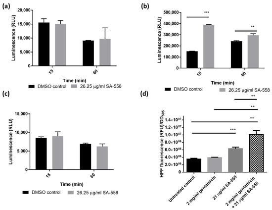 Effect of SA-558 on ATP and ROS level of bacterial cells. (a) Effect of SA-558 on bacterial cellular ATP level in early exponential phase; (b) Effect of SA-558 on bacterial cellular ATP level in early stationary phase; (c) Effect of SA-558 on cellular ATP level in Vero cells. Statistical significance was determined by Student’s t test (** p < 0.01 and *** p < 0.001); (d) Effect of SA-558 and/or gentamicin on ROS level of S. aureus Mu3, monitored by HPF normalized with OD595. (e) Effect of SA-558 and/or thiourea on ROS level of S. aureus Mu3, monitored by H2DCFDA normalized with OD595. (f) Effect of SA-558 and/or thiourea on bacterial survival of stationary phase S. aureus Mu3. Statistical significance was determined by one-way ANOVA (* p < 0.05, ** p < 0.01, *** p < 0.001 and **** p ≤ 0.0001). (a–e) The data are representative of three independent experiments. (f) Pooled means of three independent repeats were presented. Bars represent the mean ± SD.