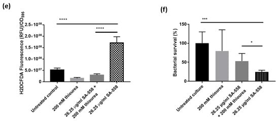 Previous studies [,] suggested that increasing ATP would lead to redox physiological alteration and contribute to the lethality of bacteria. Following the observation that SA-558 increased ATP levels in stationary phase S. aureus (Figure 4b), we hypothesized that SA-558 activity is mediated by ROS production and tested the hypothesis by using ROS indicators. Studies [,] showed that bactericidal antibiotics kill bacteria by induction of hydroxyl radicals, and perturbations which interfere with ROS accumulation result in antibiotic tolerance. Hydroxylphenyl fluorescein (HPF), which is oxidized by hydroxyl radicals with high specificity [], was used to study the effect of SA-558 and/or gentamicin in bacteria. Gentamicin only caused a minor increase in ROS level, which may explain the gentamicin tolerance observed in bacteria (Figure 4d). In contrast, SA-558 significantly increased the ROS level in S. aureus cells (Figure 4d). When combined with gentamicin, the ROS level in bacterial cells was further enhanced (Figure 4d). We further tested the effect of SA-558 on ROS production by using a general ROS indicator, H2DCFDA. SA-558, at 26.25 µg/mL, significantly increased the ROS level in stationary phase S. aureus cells, and the increase in ROS caused by SA-558 was suppressed by thiourea, an antioxidant (Figure 4e). Furthermore, SA-558’s antibacterial activity in stationary phase S. aureus was reduced by the addition of thiourea (Figure 4f). Taken together, SA-558’s activity against antibiotic-tolerant S. aureus population is mediated by ROS induction.