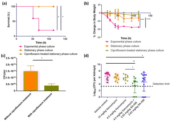 To investigate the potential efficacy of SA-558 in vivo, we first established a persistent bacteremia infection model in mice. The mice were intravenously (i.v.) infected with different forms of S. aureus: (1) a stationary phase culture, (2) a stationary phase culture treated by ciprofloxacin (4× MIC), and (3) an exponential phase culture. Mice infected with persistent forms (stationary phase and ciprofloxacin-treated stationary phase) develop less severe infection, when compared to exponential phase bacteria. At similar inoculum, no lethality was observed in groups inoculated with (1) the stationary phase culture and (2) the stationary phase culture with ciprofloxacin treatment, while 80% of mice inoculated with (3) the exponential phase culture died (Figure 5a). The effect on body weight was smaller in the group inoculated with the ciprofloxacin-treated stationary phase culture when compared to the stationary phase culture (Figure 5b). As shown in Figure 5c, the overnight culture exposed to ciprofloxacin (4× MIC) treatment has four-fold lower bacterial abundance, as compared to that without ciprofloxacin treatment. As ciprofloxacin treatment selects a proportion of the whole population (stationary phase culture), the stationary phase culture treated by ciprofloxacin might be the most representative form of the cultures for studying persistent infections [,,].