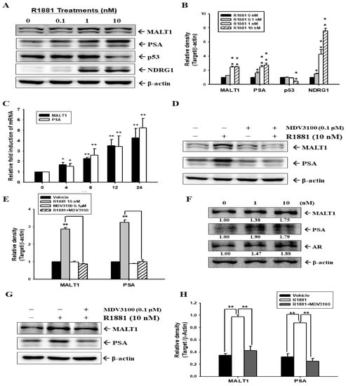 Effect of androgen on MALT1 expression in AR-positive prostate carcer cells. The LNCaP cells were treated with various concentrations of R1881 for 24 h. The cells were lysed and then MALT1, PSA, p53, NDRG1, and β-actin were determined by immunoblot assays (A) and the quantitative data were expressed as the intensity of protein bands of the target proteins/β-actin relative to the control vehicle-treated group (B). (C) The LNCaP cells were treated with 10 nM of R1881 as indicated. The mRNA levels of MALT1 and PSA relative to time 0 were determined by RT-qPCR assays. The LNCaP were cotreated with/without 10 nM R1881 and/or 0.1 μM MDV3100 as indicated for 24 h. The cells were lysed, then MALT1, PSA, and β-actin were determined by immunoblotting (D) and quantitative analysis (E). (F) The 22Rv1 cells were treated with various concentrations of R1881 for 24 h. The cells were lysed and then MALT1, PSA, AR, and β-actin were determined by immunoblotting. The numbers indicate the ratio of target proteins/β-actin in relation to vehicle treatment. The 22Rv1 cells were cotreated with/without 10 nM R1881 and/or 0.1 μM MDV3100 as indicated for 24 h. The cells were lysed, then MALT1, PSA, and β-actin were determined by immunoblotting (G) and a quantitative analysis was presented as a relative density of MALT or PSA/β-actin (H). * p < 0.05, ** p < 0.01.