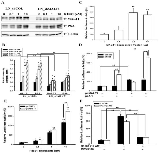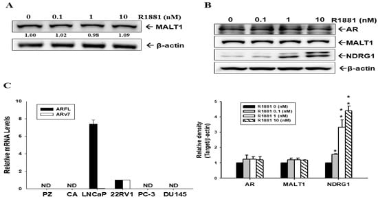 Prostate-specific antigen (PSA) is a well-known tumor marker of prostate cancer []. The androgen directly regulates the expression of PSA by binding to the AR and facilitates AR binding to the androgen response element (ARE) within the enhancer region of the PSA gene []. However, previous studies have found that NF-κB activates PSA expression in androgen-dependent and -independent prostate cancer cells [,]. A recent study has elucidated that caffeic acid phenethyl ester, a bioactive component of propolis with antagonistic activity to androgen and NF-κB, blocked MALT1 expression via androgen and NF-κB signaling, suggesting that MALT1 may have a critical role in the crosstalk between AR and NF-κB signaling in human prostate cancer cells in vitro and in vivo []. However, the molecular mechanisms of the regulation of AR on MALT1 in androgen-dependent and -independent prostate cancer cells have yet to be clearly established.