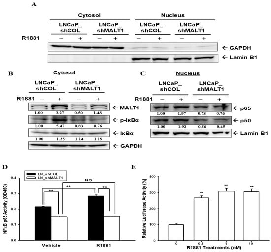 Effect of androgen on NF-κB signaling is dependent on MALT1 in androgen-dependent LNCaP prostate cancer cells. The LN_shCOL and LN_shMALT1 cells were treated with or without 10 nM of R1881 for 24 h. (A) The expression of GAPDH in cytosol and Lamin B1 in the nucleus were determined by immunoblotting after the separation of nuclear and cytoplasmic fractions as indicated. The expression of MALT1, IκBα, phospho-IκBα, and GAPDH in the cytosol fraction (B), as well as p65, p50, and Lamin B1 in the nuclear fraction (C), were determined by immunoblotting. The numbers indicate the ratio of target proteins/GAPDH or Lamin B1 in relation to vehicle treatment. (D) The NF-κB (p65)-binding activity in the LN_shCOL and LN_shMALT1 cells after treatment with R1881 for 18 h. (E) The reporter activity of the MALT1 reporter vector was treated with various concentrations of R1881 as indicated for 24 h in the 22Rv1 cells. The data are presented as mean percentages (±SE, n = 6) relative to the control vehicle-treated group. ** p < 0.01, NS represents no significance.