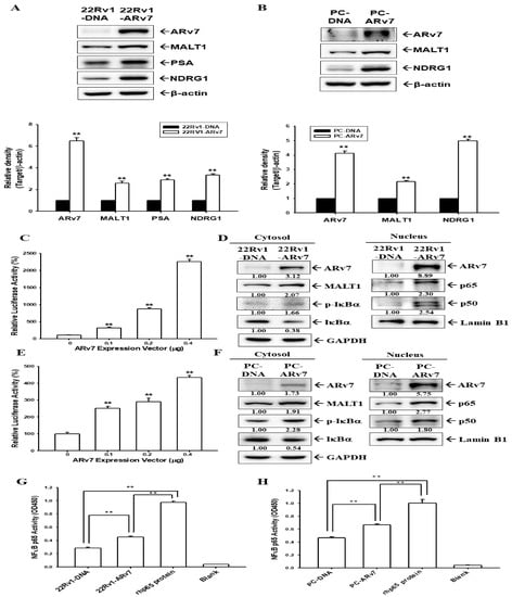 The ectopic overexpressed ARv7 in the androgen-independent prostate cancer cells, 22Rv1 and PC-3, were cloned stably. Immunoblot assays and a quantitative analysis revealed that the ectopic overexpression of ARv7 upregulated the expression of MALT1, NDRG1, or PSA in 22Rv1 (Figure 5A) and PC-3 (Figure 5B) cells. The induction of ARv7 in MALT1 expression occurs at transcriptional levels, since reporter assays found that cotransfection with the ARv7 expression vector enhanced the reporter activity of the human MALT1 reporter vector in 22Rv1 (Figure 5C) and PC-3 (Figure 5E) cells. Furthermore, the effect of ARv7 on the modulation of NF-κB signaling in 22Rv1 and PC3 cells was investigated. The nuclear and cytoplasmic fractions were separated and determined by Lamin B1 and GAPDH, respectively, showing that the ectopic overexpression of ARv7 enhanced cytosolic MALT1 protein, with the upregulation of p-IκBα protein expression in the cytoplasmic fraction and NF-κB (p50, p65) in the nuclear fraction, respectively (Figure 5D,F). Moreover, the NF-κB activity was upregulated in 22Rv1-ARv7 (Figure 5G) and PC-ARv7 (Figure 5H) cells compared with mock-overexpressed 22Rv1 (22Rv1-DNA) and PC-3 (PC-DNA) cells determined by the NF-κB (p65) transcription factor binding assays.