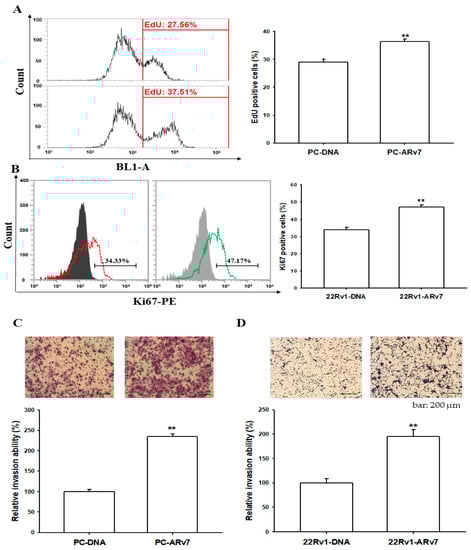 To further evaluate the role of the ectopic overexpression of ARv7 in the growth of prostate cancer cells, we used the EdU proliferation assay to determine the growth of PC-DNA and PC-ARv7 cells and the Ki67 proliferation assay to assess the growth of 22Rv1-DNA and 22Rv1-ARv7 cells. The cell proliferation assays revealed that ARv7-overexpressed PC-3 (PC-ARv7) and 22Rv1 (22Rv1-ARv7) cells possessed much higher proliferative rates compared to mock-transfected PC-3 (PC-DNA) and 22Rv1 (22Rv1-DNA) cells, respectively (Figure 6A,B). In addition, the Matrigel invasion assays showed that the overexpression of ARv7 significantly enhanced cell invasion in both the PC-3 (Figure 6C) and 22Rv1 (Figure 6D) cells.