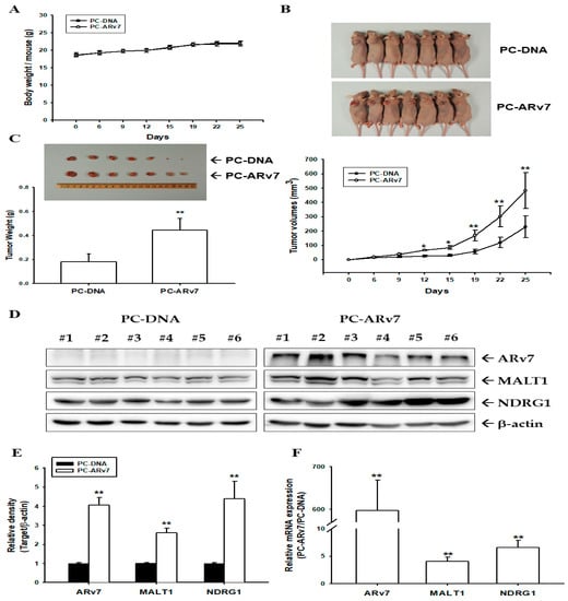 To evaluate the growth effect of the ectopic overexpression of ARv7 on ARv7-null PC-3 prostate cancer cells in vivo, PC-DNA and PC-ARv7 cells were xenografted subcutaneously in athymic nude mice, respectively. The body weight of both groups did not significantly differ during the experimental period (Figure 7A). The solid tumors derived from the PC-DNA and PC-ARv7 groups were estimated, and the tumor size in both groups was determined every 3 days (Figure 7B, top). After 25 days of xenograft, the tumor sizes (Figure 7B, bottom) were 52% lower (230.21 ± 75.18 vs. 483.84 ± 124.67 mm3) and the tumor weights (Figure 7C) were 59% lower (0.1823 ± 0.0640 vs. 0.4432 ± 0.0992 g) in the PC-DNA group than those in the PC-ARv7 group, respectively. Moreover, in the PC-ARv7-xenografted groups the levels of ARv7, MALT1, and NDRG1 proteins, as well as the mRNA levels, increased compared to the mock-transfected PC-3 groups, as determined by immunoblot (Figure 7D,E) and RT-qPCR (Figure 7F) assays. Taken together, the findings indicate that the ectopic overexpression of ARv7 enhanced PC-3 cell growth both in vitro and in vivo.