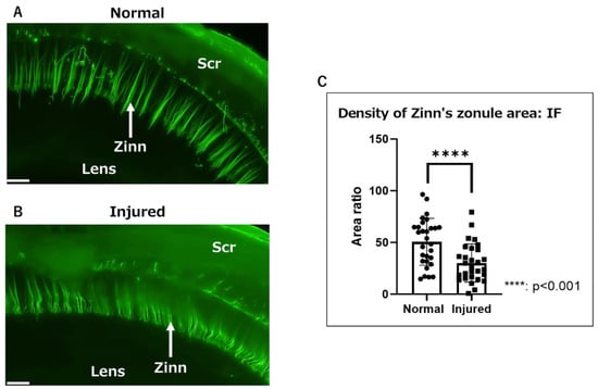 Macroscopic observation of Zinn’s zonule in gel-embedded specimens. (A,B) Fluorescence images (magnified 40×) of Zinn’s zonule in a rat eye. Zinn’s zonule was stained with anti-MAGP1 (green). (A) Zinn’s zonule was clearly visible in the normal group in a three-dimensional view. (B) The background staining was stronger and Zinn’s zonule was deflected in the injured group. (C) The MAGP1-positive area was measured for 6–8 microscopic fields per specimen. The ratio of Zinn’s zonule area over the area between the lens and scleral wall was calculated to normalize the individual differences among specimens. There was a significant decrease in the fluorescence-positive area in the injured group. Four rat specimens were imaged for the normal and injured groups and the entire Zinn’s zonule was analyzed, for both groups. Zinn: Zinn’s zonule, Scr: sclera, IF: immunofluorescence. Scale bar: 200 μm.