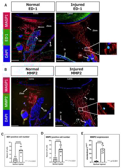 Increased infiltration of ED1-positive and MMP2-positive cells in Zinn’s zonule of the injured groups. (A,B) Immunofluorescence observations (magnified 100×) were performed on paraffin sections. (A) Nuclei were identified using DAPI (blue), macrophages using ED-1 (green), and Zinn’s zonule using anti-MAGP1 (red). (B) Nuclei were identified using DAPI (blue), MMP2-expressing cells using anti-MMP2 (green), and Zinn’s zonule using anti-MAGP1 (red). The cells in the white boxes in the figure are magnified. (C,D) Nucleated cells infiltrating Zinn’s zonule are increased in the injured group compared to the normal group. Both ED-1-positive and MMP2-positive cells are significantly increased in the injured group compared to the normal group. Four rat specimens were used for the normal and the injured groups, and three 5 μm sections were imaged from each specimen for both groups. The total number of observation areas was 9 due to the reason of the structural breakdown of Zinn’s zonule. We observed Zinn’s zonule in two locations in each section. (E) RT-qPCR was performed two times using RNA extracted from paraffin-fixed sections, showing significantly increased expression of MMP2 in the injured group compared to the normal group. A total of 100 thin sections of 10 µm thickness for each group were used for the experiments. Zinn: Zinn’s zonule, CB: ciliary body, Ir: iris. Scale bar: 100 μm.