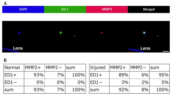 Sufficient amounts of RNA could be extracted from each sample. The mRNA expression levels of MMP2 are significantly increased in the injured group compared to the normal group (Figure 2D). Furthermore, after counting the cell classifications, we observe that many ED-1-positive cells express MMP2 (Figure 3A,B). Altogether, these results suggests that macrophages expressing MMP2 are associated with the morphological changes in Zinn’s zonule.