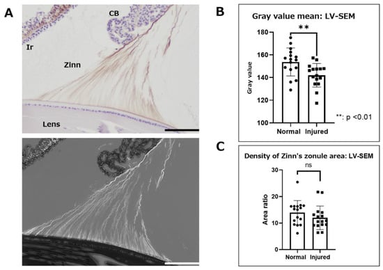 First, Zinn’s zonule was observed at low magnification (300×) to assess overall changes (Figure 4). IHC with LV-SEM observations were compared with optical microscopy observations to confirm the consistency of the positive signal in IHC and LV-SEM (Figure 4A). The same areas that were stained with 3,3’-diaminobenzidine (DAB) using MAGP1, meaning they could be observed by LV-SEM as an enhanced signal with higher brightness. We then compared the normal and the injured groups for gray values, which is a measure of the color intensity of stained areas. A comparison of gray values was used to estimate differences in the amount of MAGP1. Furthermore, we estimated the relative area of Zinn’s zonule by comparing the ratio of the area enclosed by the anterior and posterior branches as well as the lens (Figure 4C). The results of the measurement of MAGP1 intensity at low magnification show a significant difference between the normal group and the injured group in color density (Figure 4B). On the other hand, the area ratio does not show any significant difference between the two groups (Figure 4C). These results suggest that inflammatory changes in Zinn’s zonule are not quantitative but qualitative, and result in a decrease in MAGP1.
