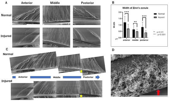 Next, we observed these samples at higher magnification (1500×) to assess changes in the ultrastructure of Zinn’s zonule in detail. We observed the anterior, middle, and posterior branches in the area near the lens attachment site (Figure 5A) and measured the width of each Zinn’s zonule (Figure 5B). To observe the overall trend, images were connected from the anterior to the posterior branch (Figure 5C). Under high magnification, Zinn’s zonule is significantly thinner throughout the eyes with alkaline injury and the bundled structure of Zinn’s zonule is also disrupted in the injured group (Figure 5A–C).
