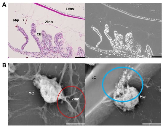 Ultrastructural observation of macrophages infiltrated in Zinn’s zonule using immunohistochemistry with LV-SEM. (A) Macrophages were labeled with ED-1. Periodic acid–Schiff (PAS) staining was used for post-staining. Areas stained with DAB are stained white by heavy metal staining in LV-SEM at 300×. Zinn’s zonule and other tissues are also stained white. Zinn: Zinn’s zonule, CB: ciliary body. Scale bar: 100 μm. (B) Macrophages were observed under LV-SEM at 10,000×. Zinn’s zonule and macrophages, which are difficult to distinguish at low magnification, become distinguishable at higher magnification due to the color density and contrast. In the red-circled area, a macrophage is observed pulling on Zinn’s zonule. In the blue-circled area, a macrophage is observed to be caving into the lens capsule. Zinn: Zinn’s zonule, LC: lens capsule. Scale bar: 5 μm.