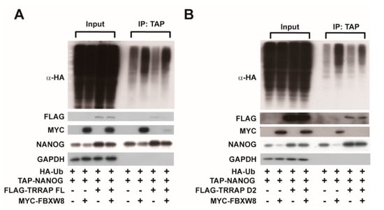 2.3. TRRAP Interferes with the FBXW8-Mediated Ubiquitination of the NANOG Protein