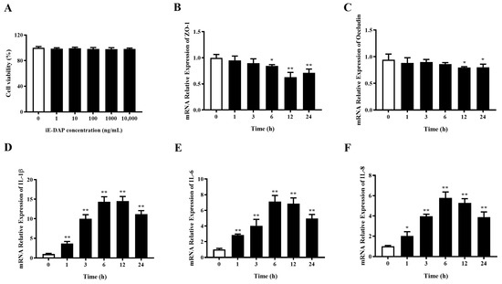 The mRNA expression of inflammatory cytokines and tight junction (TJ) protein genes in bovine mammary epithelial cells (BMECs) after γ-D-glutamyl-meso-diaminopimelic acid (iE-DAP) treatment at different time points. (A) Cell viability of BMECs treated with different concentration of iE-DAP. (B,C) Gene expression of TJ proteins and (D–F) inflammatory cytokines in BMECs treated with 1000 ng/mL iE-DAP at different time points (0, 1, 3, 6, 12 and 24 h). Results were expressed as the mean ± SEM. * p < 0.05, ** p < 0.01, representing significant difference compared with the control group.