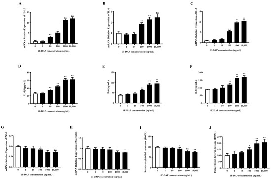 Effects of iE-DAP treatment on the inflammatory response and TJ integrity in BMECs. (A–C) Gene expression of inflammatory cytokines in BMECs after treatment with 0, 1, 10, 100, 1000 and 10,000 ng/mL iE-DAP for 12 h. (D–F) The concentration of inflammatory cytokines in culture supernatant of BMECs after treatment with iE-DAP. (G,H) Gene expression of TJ proteins in BMECs treated with different concentration iE-DAP for 12 h. (I) Relative epithelial resistance and (J) paracellular dextran passage of the BMEC monolayer after iE-DAP treatment. Results are shown as the mean ± SEM. * p < 0.05, ** p < 0.01, representing significant differences compared with the control group.