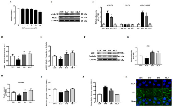 Effects of ML-7 on the TJ disruption induced by iE-DAP treatment in BMECs. (A) Cell viability of BMECs treated with different concentration of ML-7. (B,C) WB representative bands and quantitative results of MLC2 and p-MLC2 proteins in BMECs treated with 1000 ng/mL iE-DAP for 12 h after 10 μM ML-7 pretreatment for 2 h. (D,E) Gene expression of ZO-1 and OCCLUDIN and (F–H) WB representative bands and quantitative results of ZO-1 and Occludin in BMECs treated with iE-DAP after ML-7 pretreatment. (I) Relative epithelial resistance and (J) paracellular dextran passage of the BMEC monolayer treated with iE-DAP after ML-7 pretreatment. (K) Immunofluorescence results of ZO-1 in BMECs treated with iE-DAP after ML-7 pretreatment. In the immunofluorescence results, the scale bar = 5 μm. Results were expressed as the mean ± SEM. * p < 0.05, ** p < 0.01, represent a significant difference compared with the control group. # p < 0.05, ## p < 0.01, represent a significant difference compared with iE-DAP group. CON: control group; DAP: iE-DAP group; DM: ML-7 + iE-DAP group; ML-7: ML-7 group.