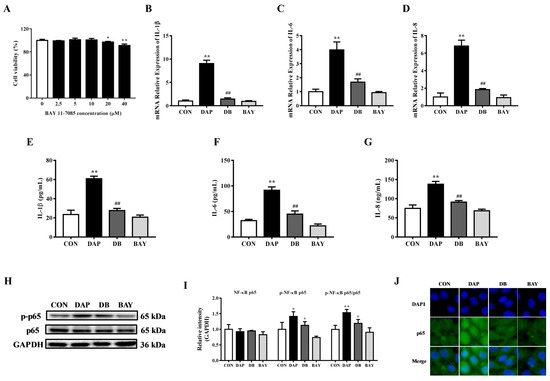 Effects of BAY 11-7085 on the inflammatory response induced by iE-DAP in BMECs. (A) Cell viability of BMECs treated with different concentration of BAY 11-7085. (B–D) Gene expression of inflammatory cytokines in BMECs treated with 1000 ng/mL iE-DAP for 12 h after 10 μM BAY 11-7085 pretreatment for 1 h. (E–G) The concentration of inflammatory cytokines in culture supernatant of BMECs treated with iE-DAP after BAY 11-7085 pretreatment. (H,I) WB representative bands and quantitative results of NF-κB signaling pathway-related proteins and (J) immunofluorescence results of NF-κB p65 in BMECs treated with iE-DAP after BAY 11-7085 pretreatment. In the immunofluorescence results, the scale bar = 5 μm. Results were shown as the mean ± SEM. * p < 0.05, ** p < 0.01, represent a significant difference compared with the control group. # p < 0.05, ## p < 0.01, represent a significant difference compared with the iE-DAP group. DB: BAY 11-7085 + iE-DAP group; BAY: BAY 11-7085 group.
