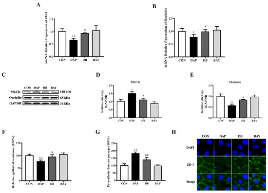 Effects of BAY 11-7085 on the TJ disruption induced by iE-DAP in BMECs. (A,B) Gene expression of ZO-1 and Occludin in BMECs treated with 1000 ng/mL iE-DAP for 12 h after 10 μM BAY 11-7085 pretreatment for 1 h. (C–E) WB representative bands and quantitative results of MLCK and Occludin in BMECs treated with iE-DAP after BAY 11-7085 pretreatment. (F) Relative epithelial resistance and (G) paracellular dextran passage of the BMEC monolayer treated with iE-DAP after BAY 11-7085 pretreatment. (H) Immunofluorescence results of ZO-1 in BMECs treated with iE-DAP after BAY 11-7085 pretreatment. In the immunofluorescence results, the scale bar = 5 μm. Results were presented as the mean ± SEM. * p < 0.05, ** p < 0.01, represent a significant difference compared with the control group. # p < 0.05, ## p < 0.01, represent a significant difference compared with iE-DAP group.