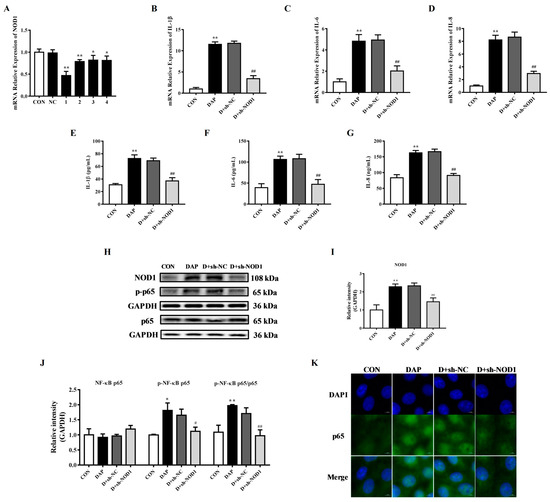 Figure 6B–G shows that sh-NOD1 transfection hindered the increase in the gene expression and release of the inflammatory cytokines IL-1β (p < 0.01), IL-6 (p < 0.01) and IL-8 (p < 0.01). WB results showed that transfection of sh-NOD1 significantly reduced the protein expression of NOD1 (p < 0.01), phosphorylated NF-κB p65 (p < 0.05) and the phosphorylation ratio of NF-κB p65 (p < 0.01) (Figure 6H–J). Cellular immunofluorescence results further confirmed that NOD1 interference blocked the increased expression of NF-κB p65 and nucleus translocation induced by iE-DAP stimulation (Figure 6K).