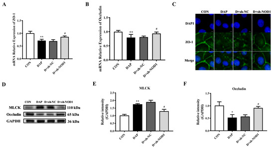 Effects of sh-NOD1 on the tight junction dysfunction induced by iE-DAP in BMECs. (A,B) Gene expression of ZO-1 and Occludin, (C) immunofluorescence results of ZO-1 and (D–F) WB representative bands and quantitative results of MLCK and Occludin in BMECs treated with 1000 ng/mL iE-DAP for 12 h after sh-NOD1 transfection for 36 h. In the immunofluorescence results, the scale bar = 5 μm. Results are reported as the mean ± SEM. * p < 0.05, ** p < 0.01, represent a significant difference compared with the control group. # p < 0.05 represent a significant difference compared with the iE-DAP group.
