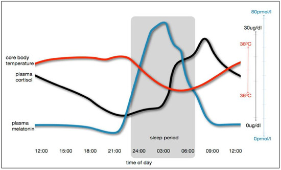 Within-day variations observed in the body temperature and melatonin and cortisol concentrations; reprinted from Ref. [84]. The within-day variation in body temperature is in the opposite direction to the variation observed in melatonin and cortisol.