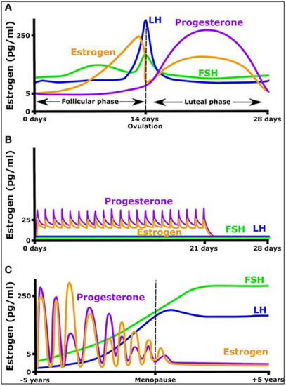 Hormonal changes observed during (A) a normal menstrual cycle, (B) when taking an oral contraceptive containing both progesterone and estrogen, and (C) in the years before and after menopause. Various factors such as pharmacological agents, diseases, or age (a physiological factor) can change the pattern of infradian variations in the analytes; reprinted from Ref. [94].