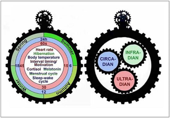 Various classification systems have been used for the biological rhythms [20]; among the most important of them is the classification based on the geophysical cycle day and night: ultradian (shorter than 24 h), circadian (almost equal to 24-h daily rhythms), and infradian (longer than 24 h) rhythms [21,22].